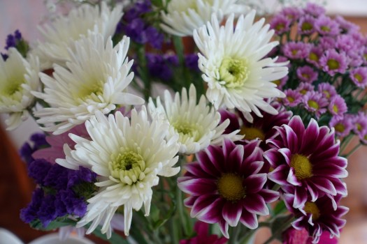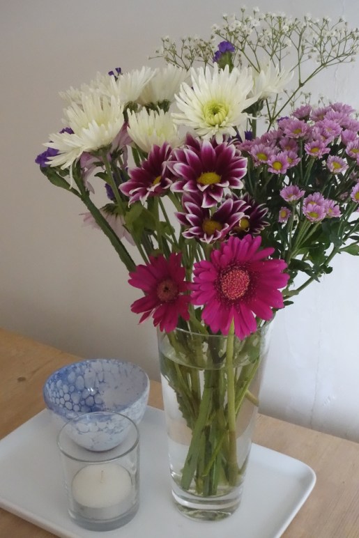 After a bit of putting away and tidying I sorted out the four vases of birthday flowers that had really past their sell by date and were in a rather sorry state. I rescued what I could (as I always like to make them last as long as I can) and as usual it is the chrysanthemums that seem to last the longest. I transferred anything that still had any signs of life into a smaller vase.