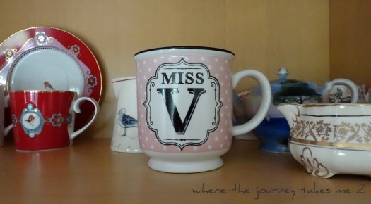 The new addition – the mug with Miss V was a leaving present from one of my colleagues – every morning for almost 19 years we would greet each other with ‘morning miss T’ and she would reply’ morning miss V’. The mug is a wonderful reminder of our friendship.
