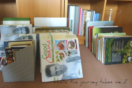 This did mean spreading out a bit more and to do this I removed the cookery books from these two shelves to create space for the less used white dishes, the table mats and my beautiful Finish red enamel bowl bought in the sixties.