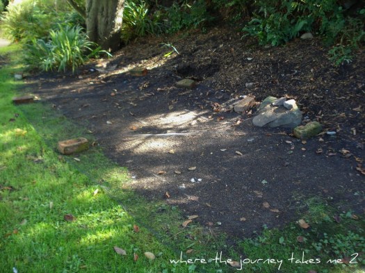 To one end of this border is the large conifer tree with spreading branches – nothing wants to grow under it save the Montbretia.  At the other end we have a Viburnum Tinus which is blooming well at the moment and a self-seeded Fuschia now the size of a small tree – but I like it so I let it stay.  The little group of Mahonia Charity are becoming a little leggy and I have threatened them with the chop – this seems to spur them on to producing some new side shoots – I will still sneak up on them and chop them down a bit though.A while ago we dug this patch over…and lay some grass seed… but it only partly helped for a while and now it is just another spot for the buttercups to take over if the campions don’t get there first.