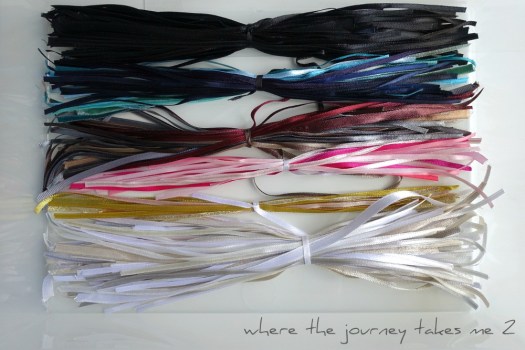 Tackling the clear out and cleaning in small stages gives me chance to evaluate what I need and use and work with it for a few days until the space is simplified down to the basics.Moving on to the craft items my first task was to sort through the mass of ribbons I had collected over the years.  I had a stack of narrow ribbon hanger loops that are used to keep garments on the hangers in shops and I always cut them off – they are perfect for using on cards and tags and I have tied them up into neat bundles by colour range.