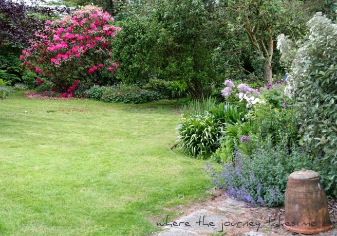 This is what we call the the back garden although it is really at the front of the cottage and leads into the woodland – we are quite secluded down here with the canopy of trees. The rhododendron has been magnificent this year and the ground beneath is littered with petals like giant confetti.
