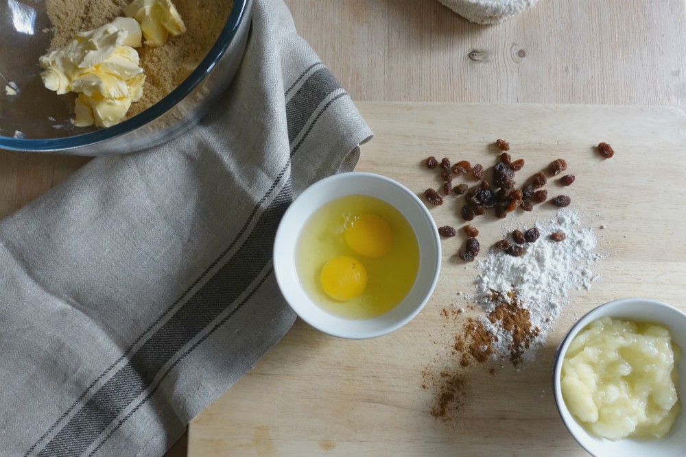 Despite the blemishes and scars on the outside the flesh on the inside was still good; so we have been peeling and slicing, cooking and freezing apples all week and yesterday I used two of them to make one of my all time favourite recipes for this time of year – Apple and sultana cake. The original recipe from Good Housekeeping Basic Cookery uses raisins but I much prefer the juicier sultanas.