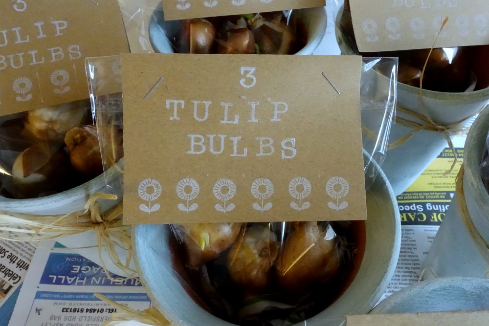 Remember the free pots I got from the lady in the village where our cottage is? I used six of these and a bag of 18 mixed tulip bulbs from Sainsbury’s for £3 to fill them. I stuffed each pot with a little crumpled newspaper and made up a cellophane bag (those that birthday cards are wrapped in) containing three bulbs – added a hand stamped label and nestled the pack of bulbs on the top……tied a piece of raffia around and …voila.