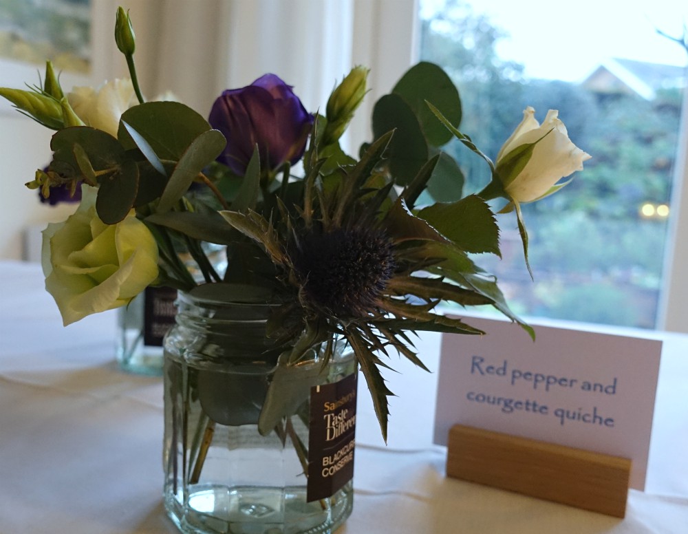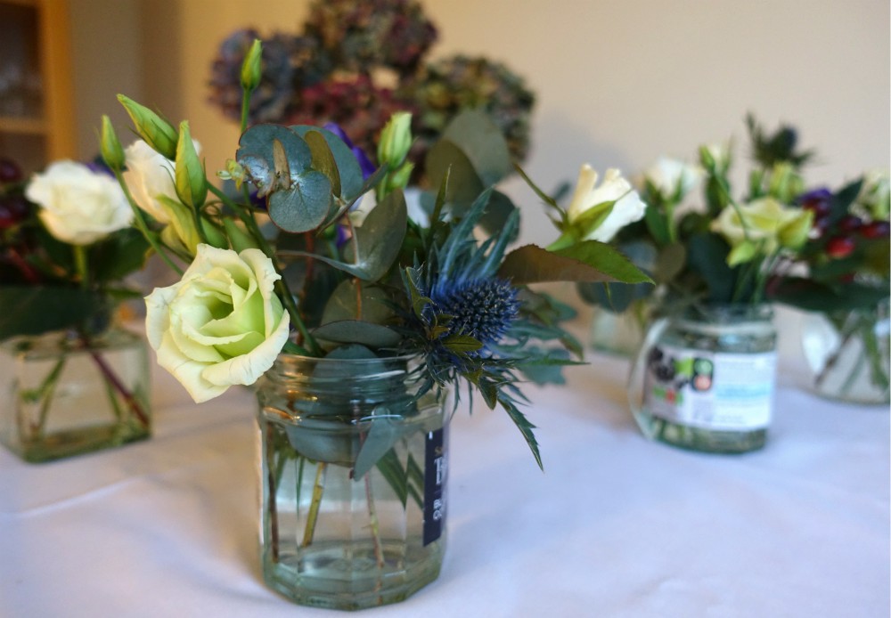 I was too busy on the day organising and laying out the food for our guests to take any photos of the hall with all the tables laid out – shame as it did look lovely – but I have a few pictures taken whilst I was making up the little jam jars of posies for the table settings and having a practice run at home the day before.