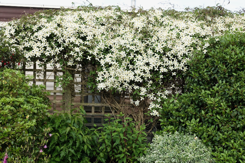 Further along the border there is no sign that the clematis Montana Reubens will stop flowering anytime soon it is still dripping in flowers this year even though we hacked it back with no precision at all – it must like a good hair cut.
