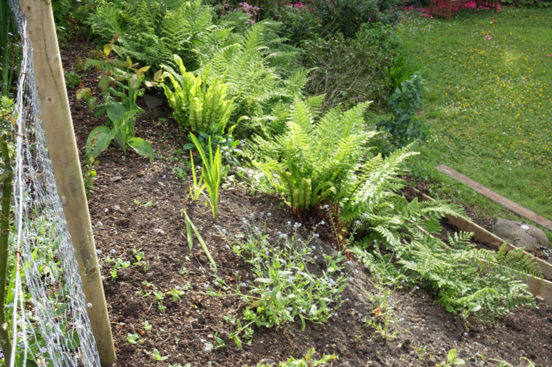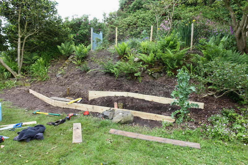 As you can see from the photo ferns love to grow here – they are all self seeded but it would be nice to have other plants here as well – the jury is out on what the planting might be but I have some ideas churning around. We have been building the banking up over time with rotted compost from our bins and it is extremely fertile. Rather than have the planks in straight lines we are running them at angles to form wider and narrower beds for more interest and some of the boards will be single height and some double.