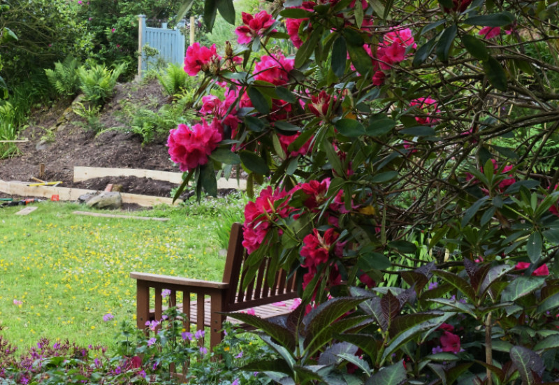 Meanwhile DH did a tip run with umpteen bags of garden waste in the trailer and on his return he continued with our new project….the banking that runs down beside the lane. We thought it was quite steep until we saw the open garden at the weekend where it was almost vertical in places; ours is not quite as bad as that. A while ago we had the idea to terrace it just using planks of treated timber – this will give the plants a more stable pocket of soil to grow in and prevent them from toppling over in the wind as well as making it easier to weed. Many a time I have been balancing at the top of the slope and lost my footing only to end up sliding all the way down.