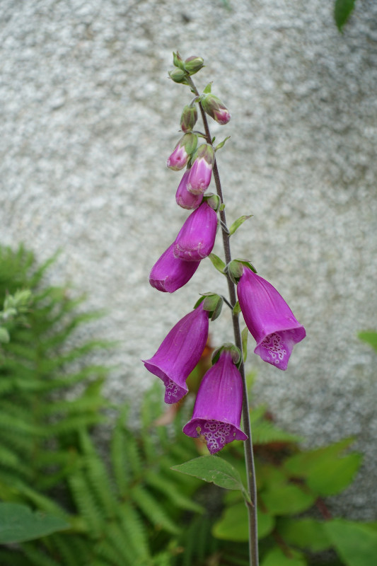 Love the foxglove–always makes me think of tiny, inverted teacups with little paintings on the inside. Your angled terracing looks great. Anything that keeps the plants in place and you from rolling down the embankment is definitely a winner.