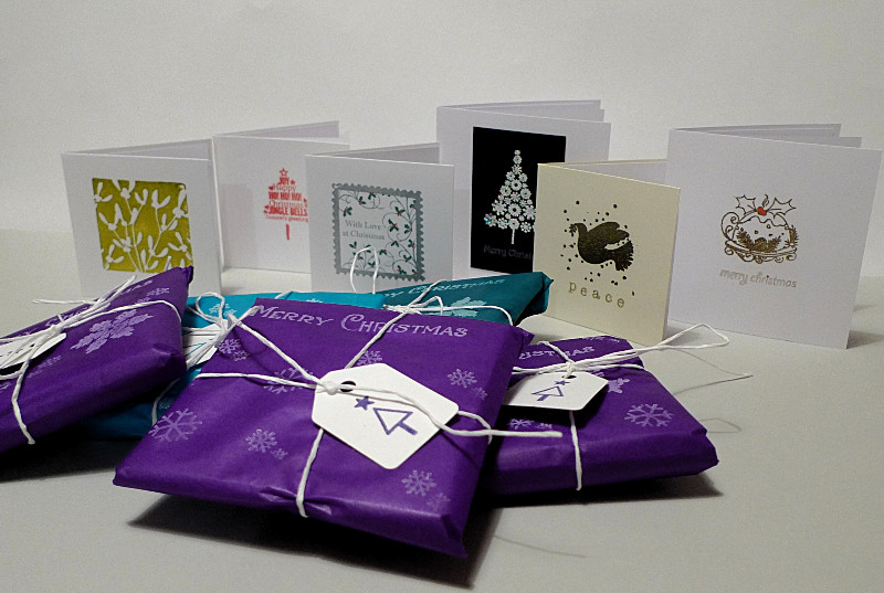 Using a variety of stamps and coloured inks I made an assortment of six little Christmas cards and packaged them in these pretty tissue parcels – all hand stamped.