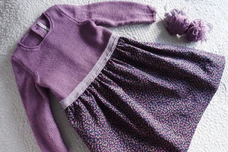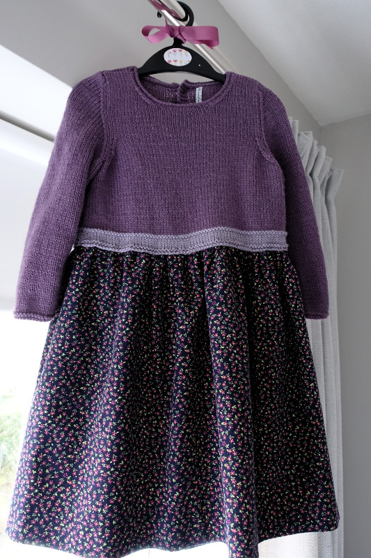 The little dress for Sweetie with a knitted top and soft printed baby corduroy for the skirt. I hadn’t been able to find a pattern in the shops or online that had a knitted bodice and fabric skirt and then I came across this little book in The Works.