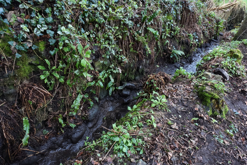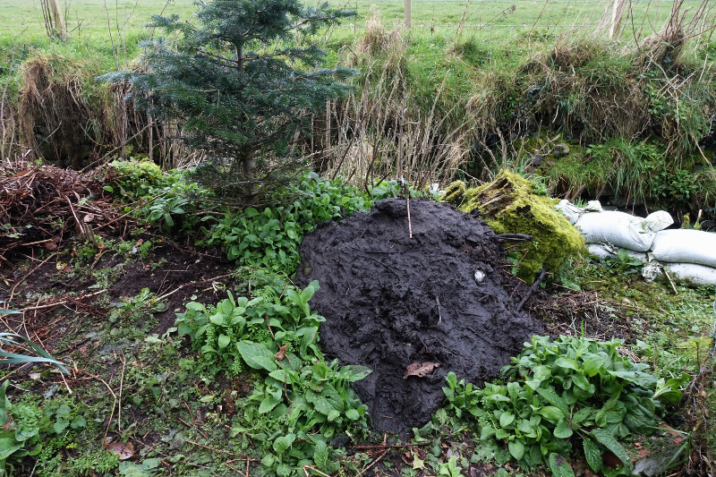 This is part of the ditch above and the resulting mud pile below. The mud is being used to build up this part of our stream bank which is the lowest point and where the water seeps over into the garden when we have too much heavy rain – hence the temporary sandbags to the right of the picture..