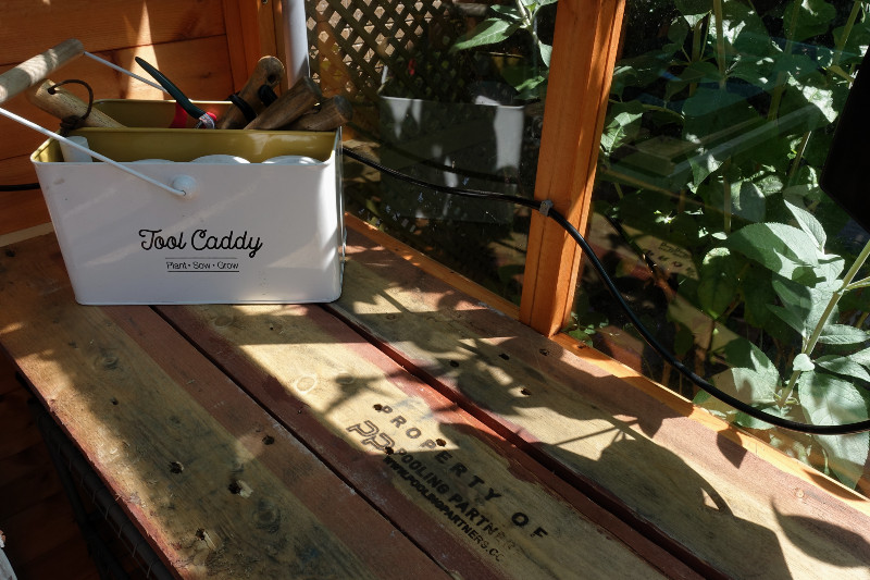 Last week he managed to recover an old pallet from a neighbour’s skip to put in some more staging. I love the vintage look of the wood from old pallets and even though we are going to paint the greenhouse the shelves will remain unpainted.