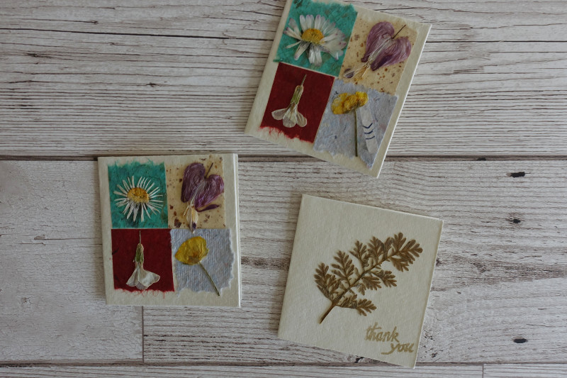 I had a packet of tiny handmade paper cards in my stash that I had bought years ago and I thought they might make nice gift tags. So nothing is wasted I used some of the tiniest scraps of handmade papers to create the chequered background onto which I placed just one contrasting flower head in each square and collectively they now make quite an attractive design. Even tiny bits of fern can be effective when mounted.