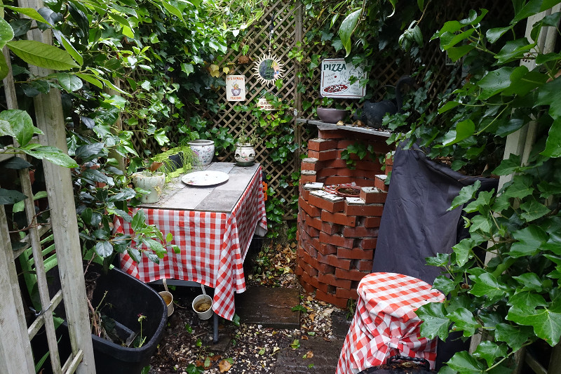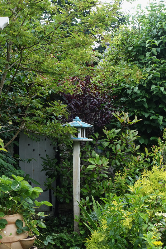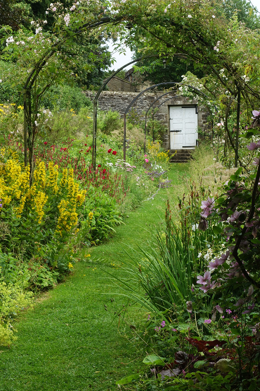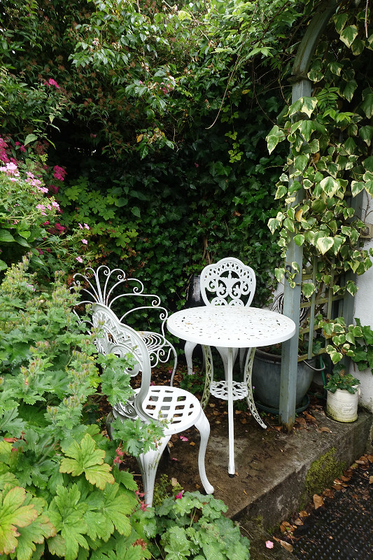 So many little seating areas to discover as you edge your way along narrow paths between the plants and crouch low under the home made rustic pergolas groaning under the weight of honeysuckle and roses.