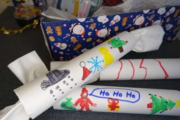 Master Freddie made these crackers himself for the boxes ages ago, in fact I bet he has forgotten all about them. I managed to poke a Santa chocolate in through the end for good measure.
