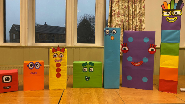 It took us most of the week to source the bits we needed to build seven number blocks. Not quite cubes, as we used mainly the empty wine boxes Sainsbury’s put out for customers to take, as they were free. Finding the plain coloured paper was not easy and a roll of orange was not to be had anywhere and too late for us to order any, so we had to improvise and join a few sheets of orange A4 card together that we had left over from Halloween (but it did the job…and here they are).