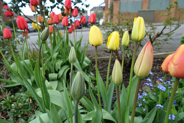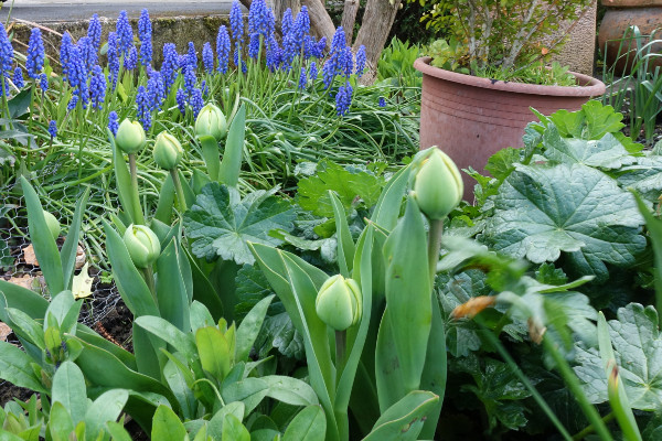 The tulip Sun Lover which is a vibrant orange with yellow streaks has also made another appearance and will be in full flower soon to add to the display. They all contrast well with the deep blue grape hyacinth and the forget-me-nots. I have yet to find out if any of the unopend buds are Queen of the Night, a rich velvety purple colour.