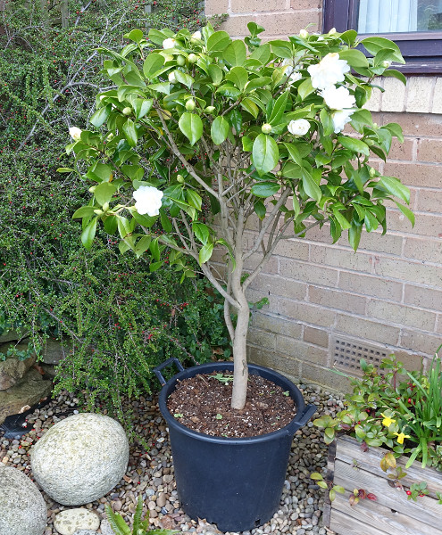 The camelia that had one flower last year is flowering and has been moved to the front of the house.