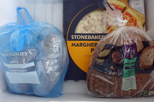 Most of the items in my freezer are standby products, a pizza, a bag of chips, garden peas, broad beans and edame beans (all the vegetables we neither grow or buy and cook fresh). I also keep it stocked with bread, grated cheese, stewed apple or plums, fresh herbs and a few bits and pieces like fish fingers for the grandchildren. At the moment we need to make more nutloaf – it is on the list.