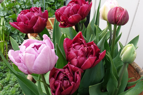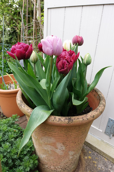 The tulips I planted last autumn with more subdued colours are looking really nice too and not too tall either, so they haven’t been beaten down by the wind and rain.