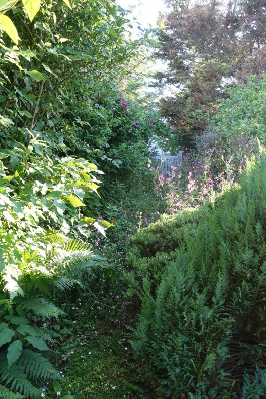 Most of this strip is wild flowers – pink campion and bright orange Crocosmia which grow and spread like weeds but nearer the gate I have pink Geranium, Aquilegias and Harts Tongue Ferns and I am slowly introducing Foxgloves.