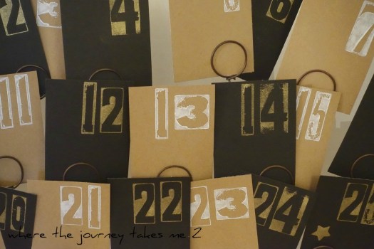 For the calendar itself I decided upon some simple craft card (from a tiny pad I bought from The Range for £1) and stamped numbers on them in white or gold from 1 to 25. On the back I stuck a little ‘surprise’ activity of something pleasurable and Christmassy to do or make that day.Â