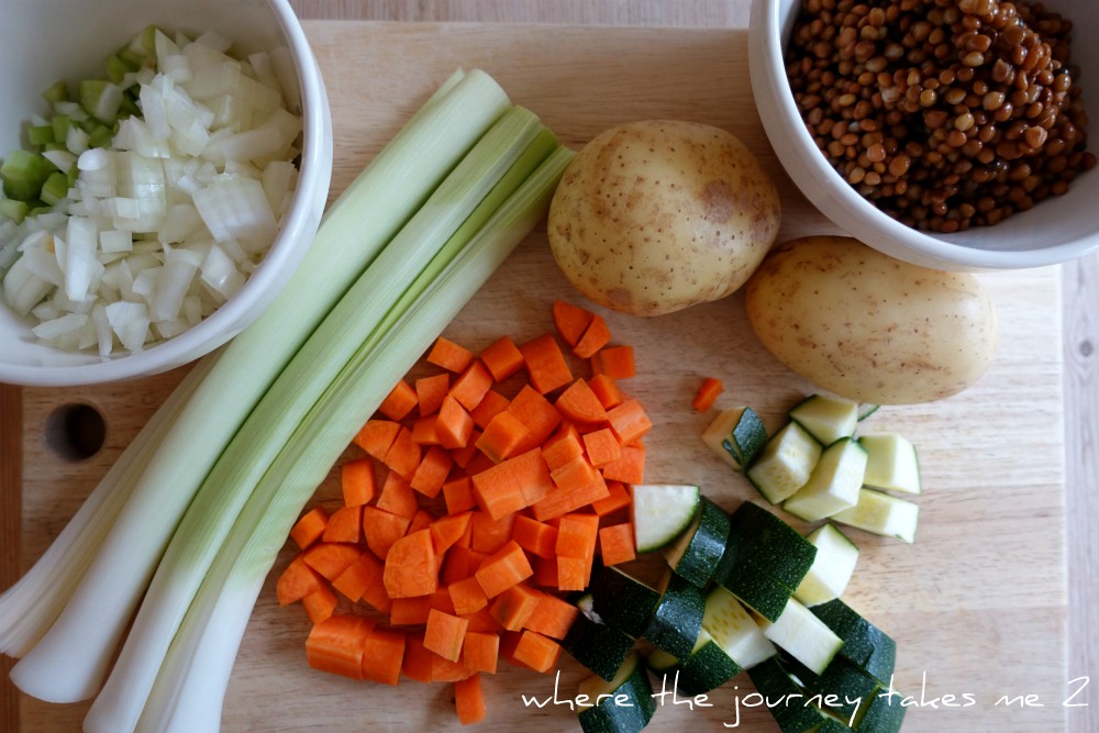 We ended the week with a few oddments – a couple of leeks, one carrot, a courgette and two baking potatoes – once chopped I added some celery and onions together with a packet of brown lentils and made a good old warming Lentil Stew – enough for two days. Eaten with a chunk of bread and butter it was everything that I love about autumn food.