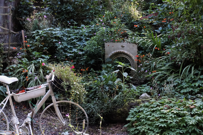 A cottage with a true upcycled garden full of repurposed artifacts. I especially love the fact that the owner has used the front of an old shed as an archway.