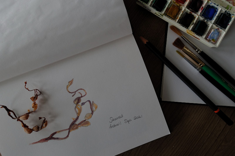 Afterwards we did a couple of quick 5 minute sketches before moving on to the Castle Kennedy estate to the tea room for a cup of tea and a scone…..saying yes to both jam and clotted cream as a treat. I brought the little piece of dried seaweed home with me so I can have another go. The light sitting on the beach was so bright that it was hard to capture the depth of colour and often it is easier to see this in a photograph more than in real life.