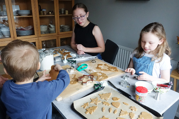 DH rolled out the gingerbread, whilst I filled the waiting oven trays once the shapes had been cut and a bonus – there was no squabbling over the cutters.