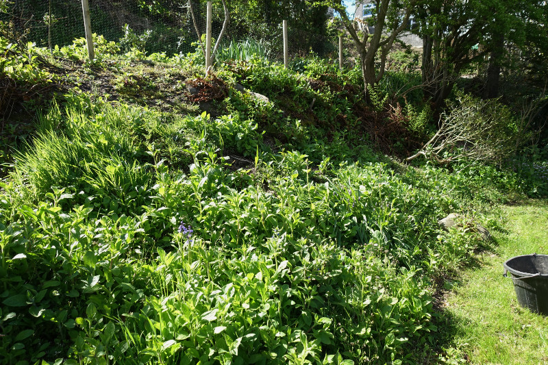 By eleven o’clock we were both out in the garden; DH on ditch clearing duty (though he was under strict orders to only clear a small part of it – mud is heavy when you have to heave it out of a ditch to higher ground, and myself….I knuckled down to weeding the trellis border.