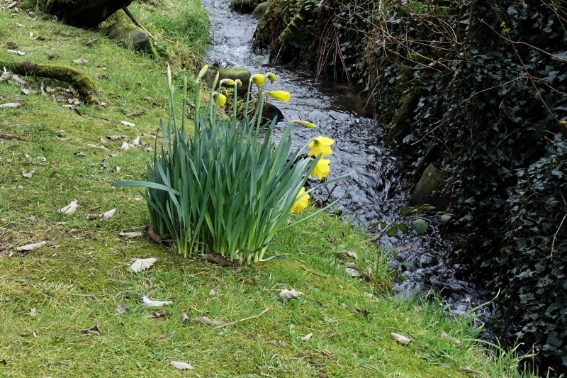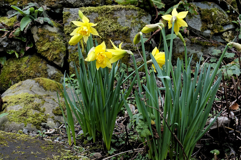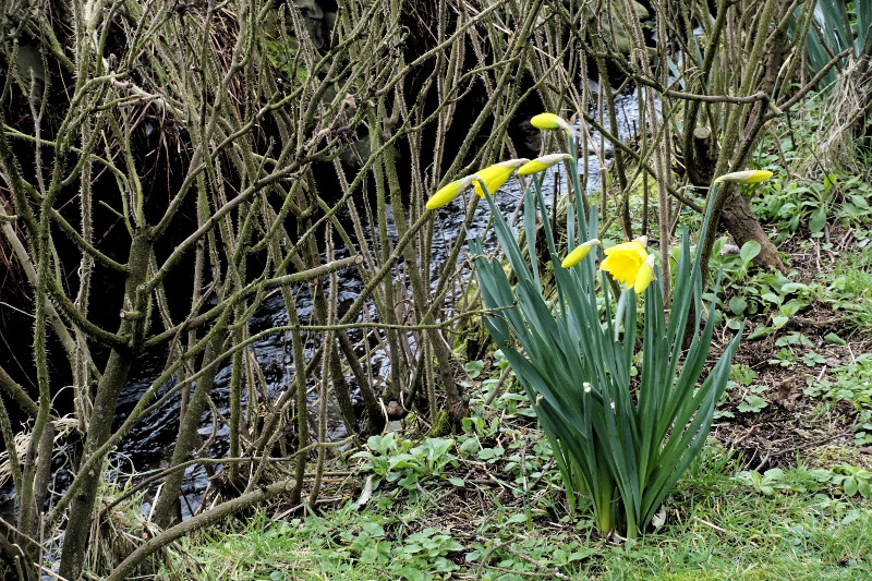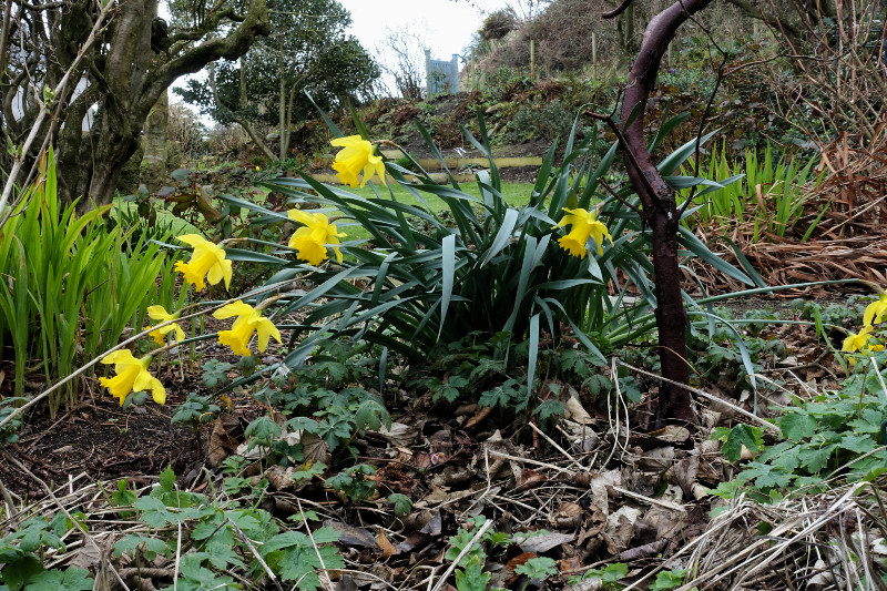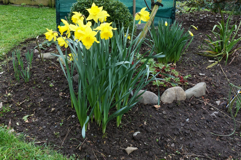 The winter has taken its toll all around the garden this year; the north westerly winds and salt spray from the sea has burnt many of the shrubs and it will take a while before we know what will spring back to life. As the snowdrops are fading away the daffodils are in full bloom, scattered around the garden creating little splashes of colour. The new bulbs, tulips and narcissi, I planted last autumn have all been dug up and eaten by the rabbits…. apparently daffodils are not to their liking and so have been spared.