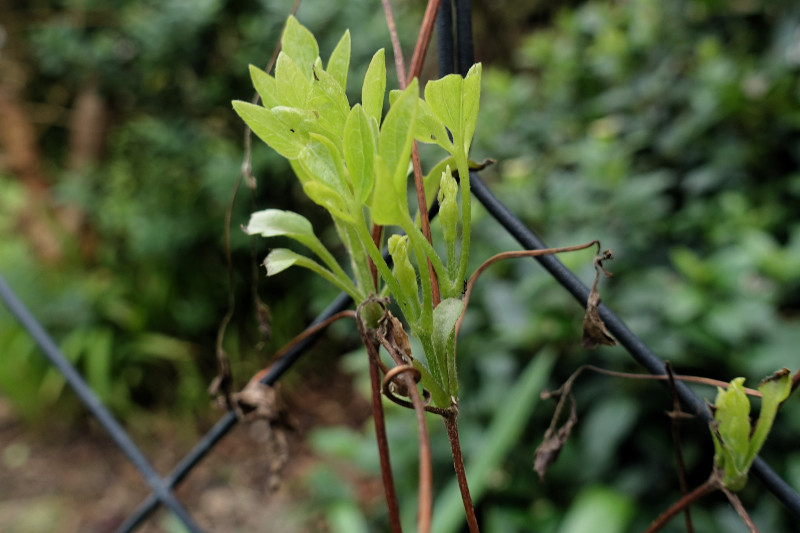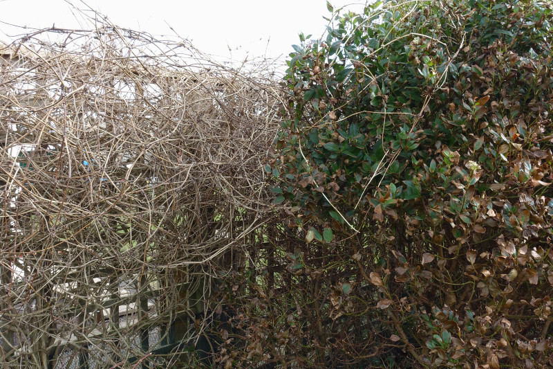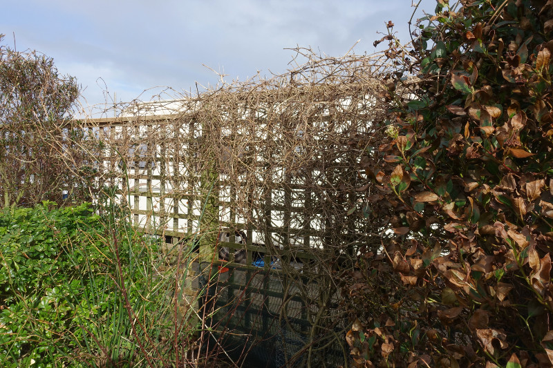 So now we are left with this a lifeless bunch of stems as they have been cut down at low level on the other side of the trellis and the top part here of intertwining stems are quite dead.
