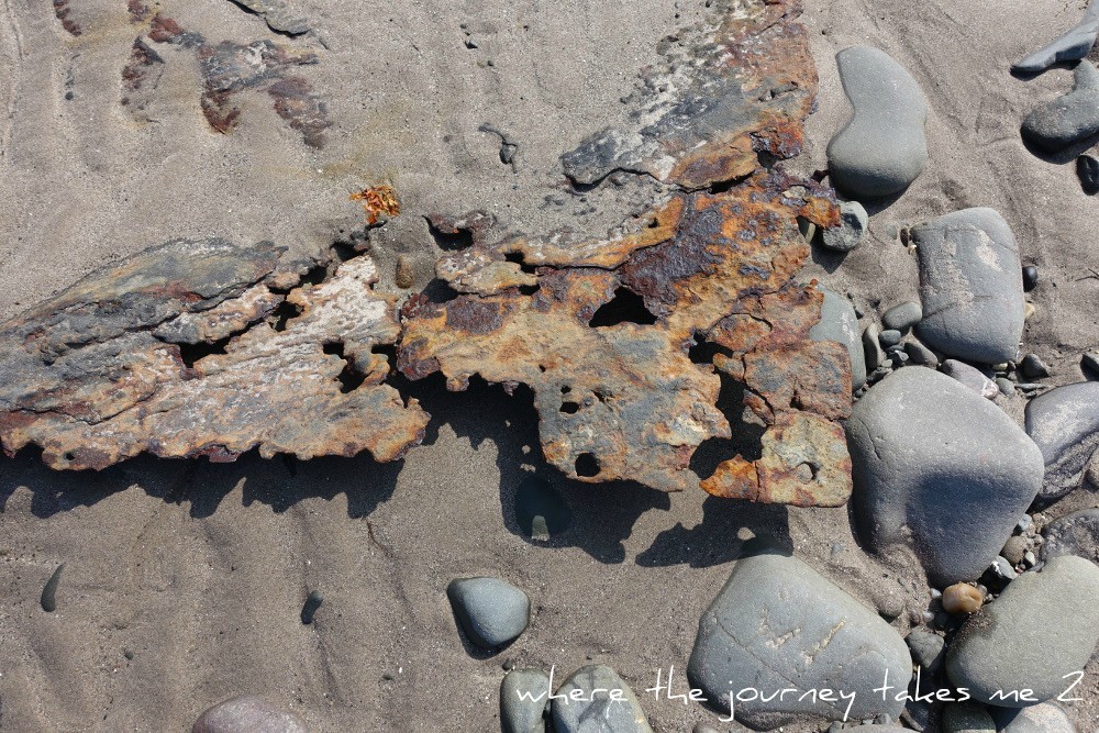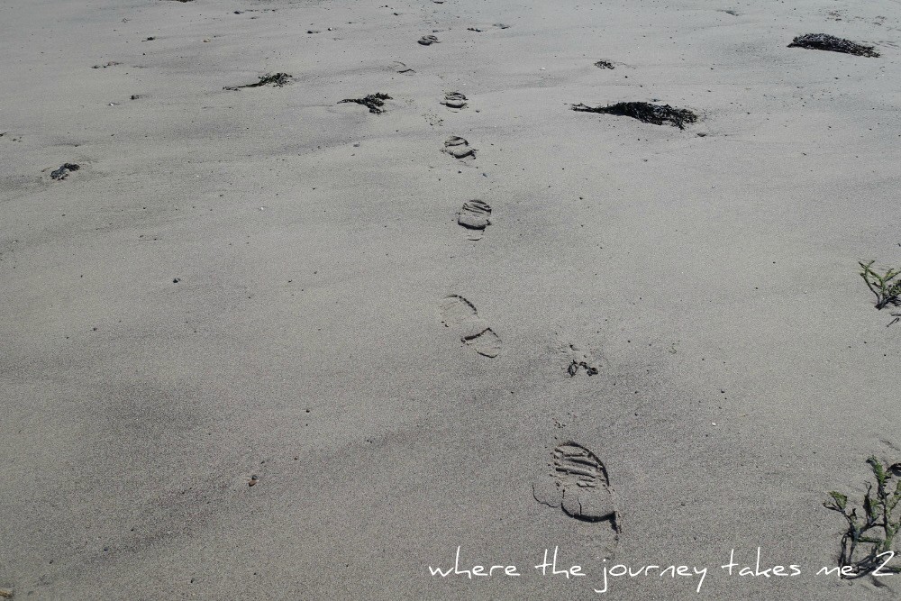 There is plenty to see along the beach, gulls flying in, gulls flying off…mysterious footprints in the sand and part buried objects and I spend some time searching our pieces of sea glass.