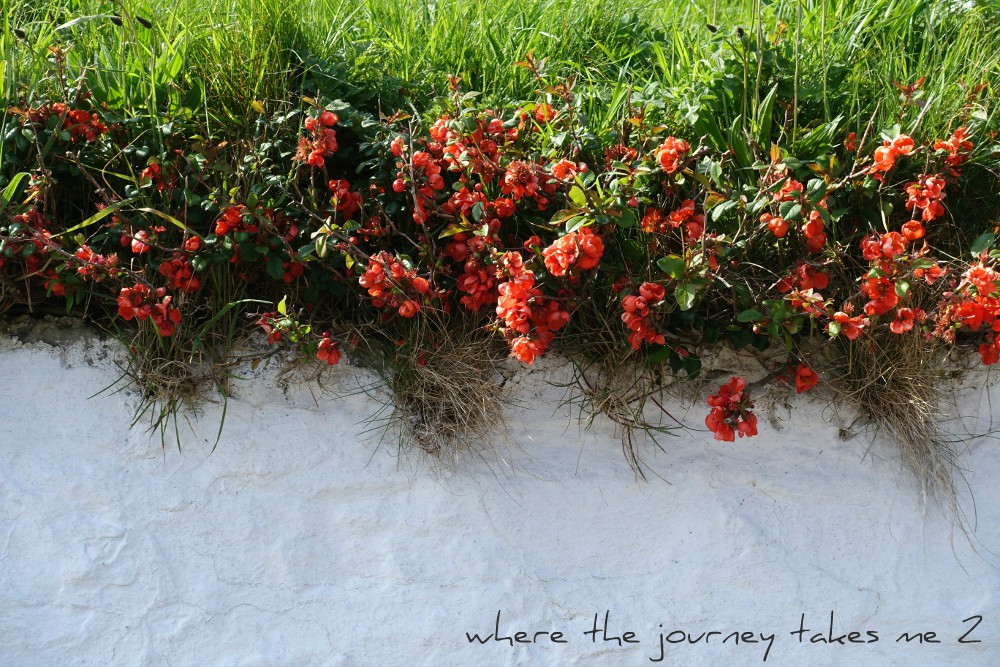 I just love this ladies garden (I admire it every time we pass) and in particular her clever use of the Japanese Quince edging the full length of her whitewashed wall. I might just have to pinch this idea for myself though I don’t have any painted walls and without the contrast with the white it would not have the same impact.