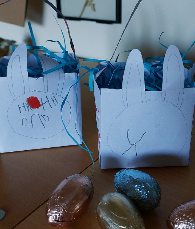 On Easter Sunday we had all the family to tea and held an Easter egg hunt in our back garden…. in the cold although… the children didn’t seem to notice the wind chill whilst busy trying to find the hidden eggs. Master Freddie made these cute Easter baskets for us all.