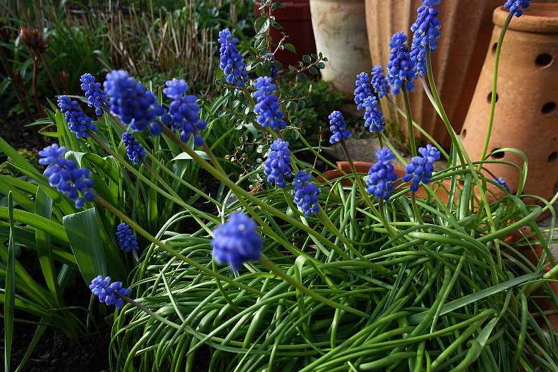 There is not a lot of colour in the garden yet – the tulips are still only in bud and the daffodils faded. There are a few primula dotted around and thank goodness for the strong blue of the grape hyacinth to cheer up the borders until everything gets going.