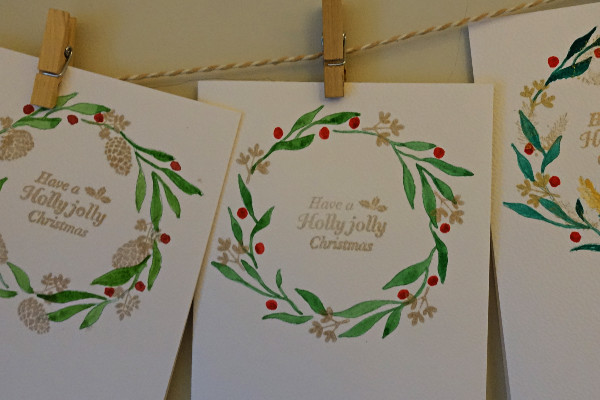 For my own homemade Christmas cards I decided on a simple wreath design and hand painted each one in watercolour paints and then over stamped with a rubber stamp and copper ink.
