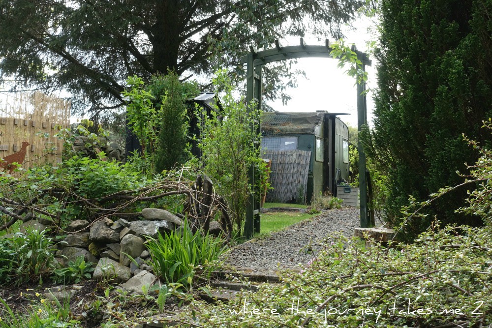 We started in the garden early today, well early for us; the sun was shining and we didn’t want to miss the opportunity so we had breakfast then I did a few floor exercises, as I have done every day, to loosen up the tight lower back muscles; not easy to do squeezed in between the table legs and the seating (space is hard to come by in a caravan),