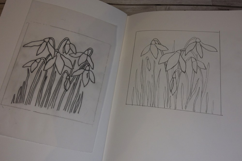 In November we attended a Lino cutting workshop for which I had prepared a sketch in my sketchbook. I decided on snowdrops and kept it simple.