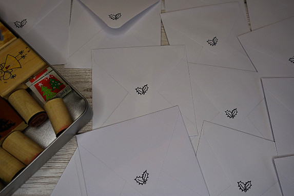 I did a tiny version to stick onto the back of the card. Before I stick the print to the card I always stamp the Happy Christmas message inside the card first just in case the rubber stamp doesn’t come out well on some of them. I also like to stamp a little Christmas picture on the back of the envelopes.
