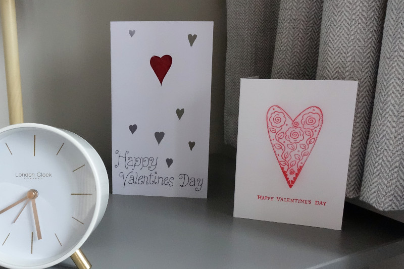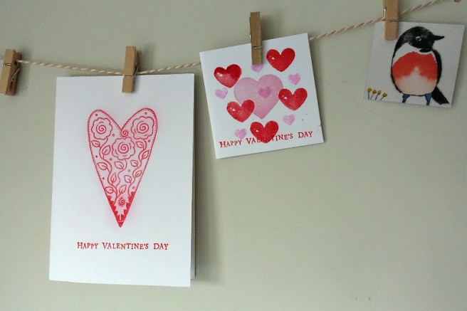 My attempt at making a Valentine’s card for DH was altogether less successful – I was very short of time and had to resort to a rubber stamp again like last year – but, I am told, it is the thought that counts – mine is the one on the right. He made one for me, the one on the left, which is much better and quite sweet.