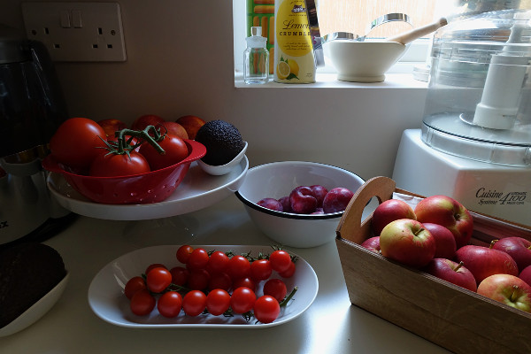 My pantry shelf has an abundance of autumn colour – it is a joy to walk in there – baskets of apples (given by my neighbour) and dishes of plums and tomatoes – none home grown I might add, this year I stuck to courgettes only as they do manage to take care of themselves and gave us a nice little yield.