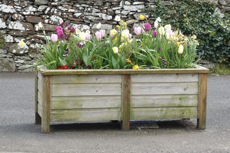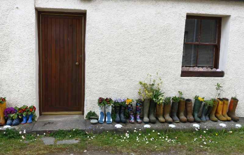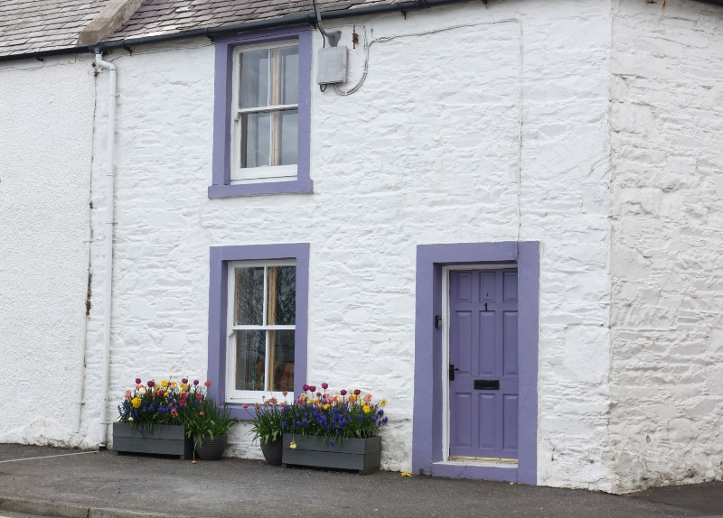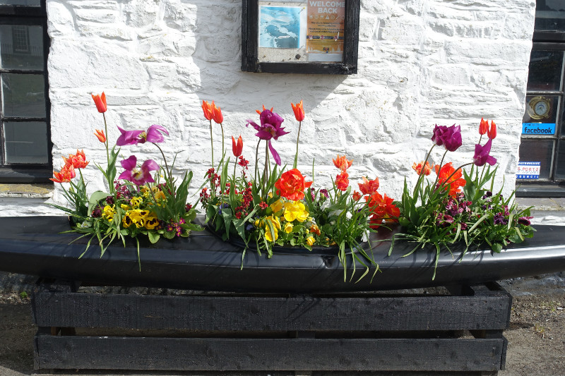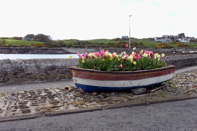 I don’t ever remember seeing it without water and the boats bobbing up and down but yesterday the tide was well out and all the boats quite still like they were sleeping. It felt warm sitting in the sun so we braved the elements and went for a stroll around the village. The wind had dropped a little by now so it seemed a shame to have come so far and not to have a walk around. There were plenty of bright little planters dotted around filled with a wonderful mix of tulips. A good use of an old boat. I have shown pictures of this village before but I can never capture too many photos here and of course the light is always different. For anyone wanting to see more pictures of the Isle of Whithorn click here.