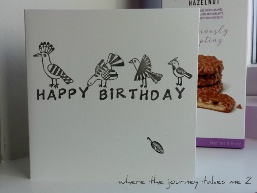I know my friend likes hand-made cards and also anything made of wood. We only buy small gifts for each other so when I saw this lovely hand carved wooden bookmark in Scotland it was the perfect present. I added a box of luxury chocolate Raisin and Hazelnut biscuits by Elizabeth Shaw (they were reduced to £1 in Sainsbury’s shhh don’t tell).