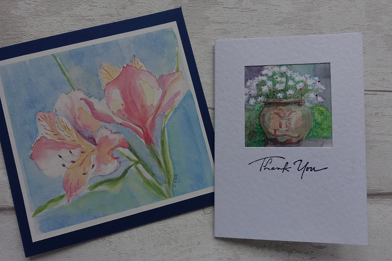 When I was clearing out the craft room last month (and it is still very much an ongoing project) I found a stack of small colour photocopies I had taken of my own watercolour sketches and turned these into little cards too.