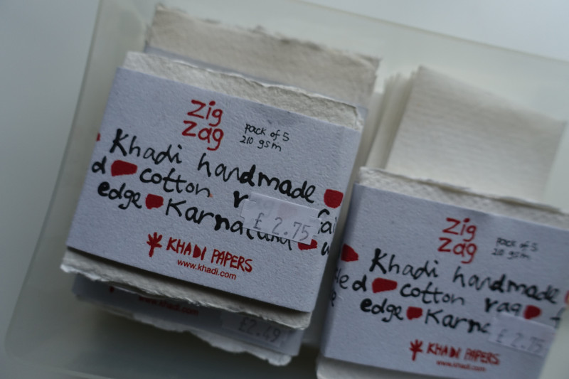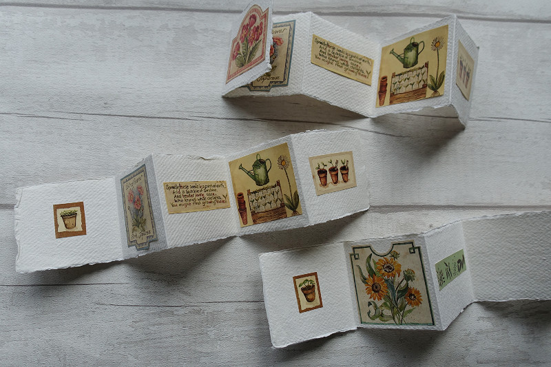 Instead of keeping it to wrap up a present I cut around each of the illustrations and together with this pack of handmade 3″ square concertina cards (a find at my local art shop that I bought last year) …..