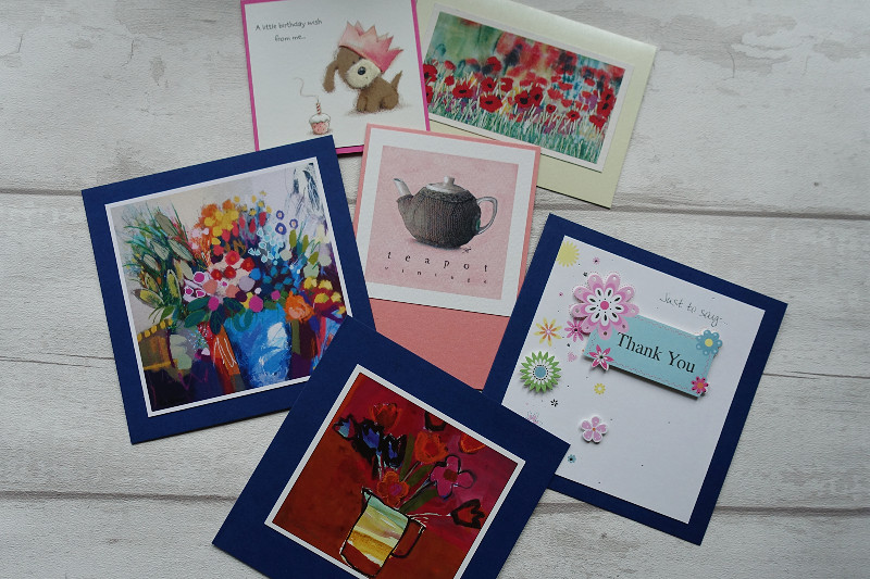 Old greetings cards, thank you notes, postcards and even those art cards you can pick up free at exhibitions and galleries can be turned into new cards. Here are some examples:-