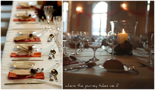 The centre pieces we made ourselves too – we bought some inexpensive large hurricane vases from Ikea and filled them with tiny dried pumpkins and a pillar candle. Around the base we placed a ring of twigs picked up on a few country walks then soaked and twisted into shape.